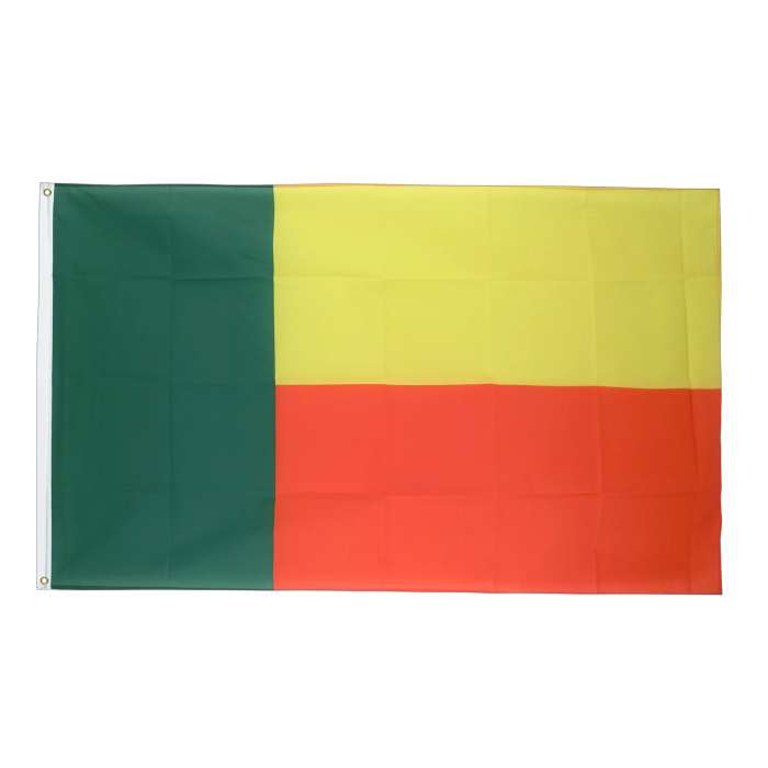 Флаг Бенина состоит из трёх цветовых блоков: зелёной вертикальной полосы у древка и двух горизонтальных полос — жёлтой вверху и красной внизу. Зелёный цвет символизирует надежду и обновление, жёлтый — богатство страны, а красный — мужество и пролитую кровь за независимость. Яркие и насыщенные оттенки наносятся методом стойкой термопечати, что обеспечивает длительное сохранение цвета даже при интенсивной эксплуатации.Назначение