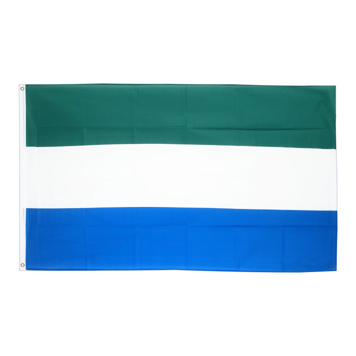 Флаг Сьерра-Леоне выполнен из полиэфирной ткани, обладающей отличными эксплуатационными характеристиками. Этот материал устойчив к погодным условиям, легко окрашивается, а его цвета сохраняют насыщенность даже при длительном использовании. Флаг представлен в традиционной расцветке: три горизонтальные полосы — зеленая, белая и синяя. Зеленый цвет символизирует природные богатства страны, белый — единство и мир, а синий — надежду и стремление к процветанию. Флаг предназначен для идентификации судов при заходе в порт Фритаун (Port of Freetown), соответствуя международным стандартам и обеспечивая их узнаваемость в морском пространстве.-