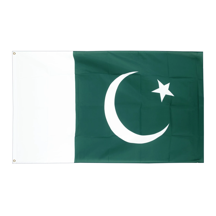 Для изготовления флага используется полиэфирная ткань с плотностью около 210 г/м². Этот материал обладает высокой прочностью и устойчивостью к ветру, осадкам и солнечному излучению. Он хорошо держит форму и легко окрашивается, что обеспечивает яркость и стойкость цветов даже при длительной эксплуатации. Лёгкость ткани способствует удобному поднятию флага и снижает его износ в ветреную погоду. Флаг Пакистана выполнен в соответствии с официальным государственным стандартом. Основное зелёное поле символизирует ислам и большинство населения страны, а белая вертикальная полоса у древка — религиозные меньшинства и стремление к миру. В центре зелёного поля размещён белый полумесяц и пятиконечная звезда — знаки прогресса и света. Все цветовые элементы нанесены чётко, краска устойчива к выгоранию и не теряет насыщенности со временем. Флаг подходит для использования при судозаходах в порт Карачи (Port of Karachi) — крупнейший морской порт Пакистана и важнейший торговый узел региона. Он соответствует требованиям международной морской идентификации и подходит для установки на судах, совершающих международные рейсы.