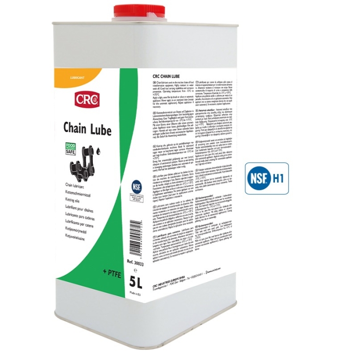 CHAIN LUBE CRC – пищевая смазка в канистре 5 л с допуском NSF H1 (№ 017046). Специально создана для цепных приводов, роликов и открытых механизмов в пищевом производстве. В составе – фторполимер PTFE для гладкого и долговечного трения, устойчивого к смыванию водой и образованию коррозии.Подробнее